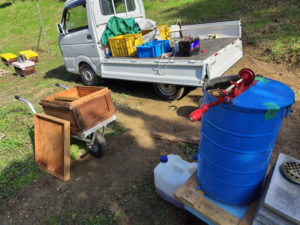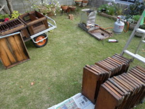 分割板や給餌器などを巣箱から取り出して次に使用するまで保管するにあたって、毎年1回もしくは2回程洗浄/消毒をしている。と言っても高圧洗浄機で取れるような類のものではないのでお湯で洗浄/消毒している。
