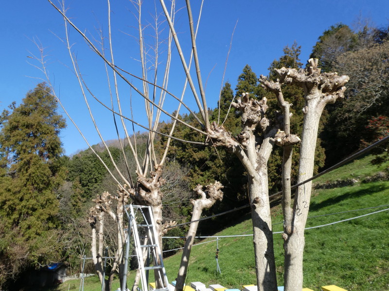 去年までは12段の三脚脚立を使っていたけど長すぎて扱い辛かったので今年は8段の三脚脚立を新たに導入。(だが、一番向こうの一番高いキハダはちょっと手が届きにくかったのでもう1段あった方が良かったのかな?)