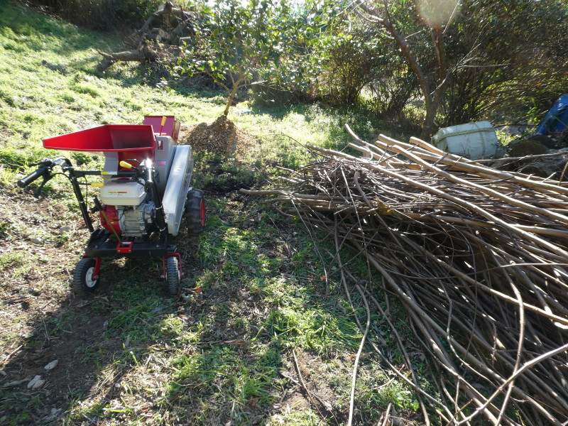 切った枝を粉砕するために午後からチッパーを持って上がって処理した。
