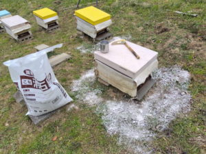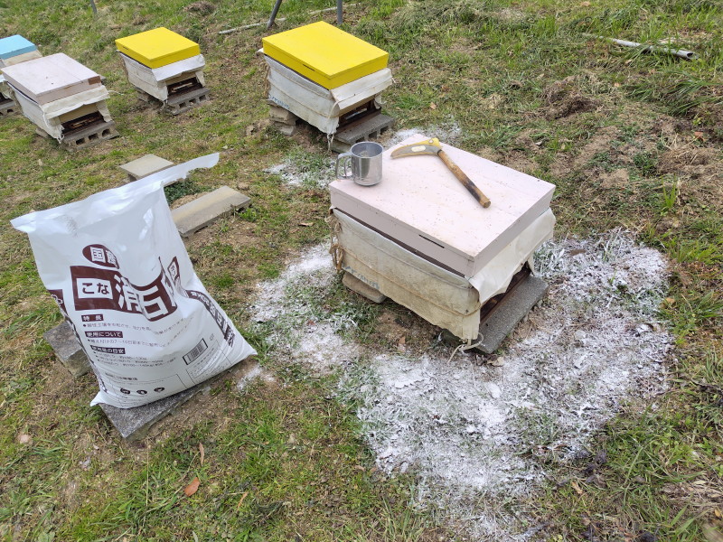 投稿日: 2026年2月10日2026年2月10日 投稿者: いろは消石灰 消石灰を蜂場に撒く。 本当は昨日撒こうと思っていたけど何と朝起きると雪が積もっていて気温も-2℃とかなので山の道が凍っているとマズイと思って今日に延期した。 少しだけど風があって粉が舞い散り気味だったけど一応全巣箱周りに撒いておいた。 今日の夕方から雨らしいので土壌に浸み込んで都合が良い。(と思う。) 追記: そういえば作業中、ウグイスが鳴いていた。もう春だなぁ・・・と思いながら作業した。